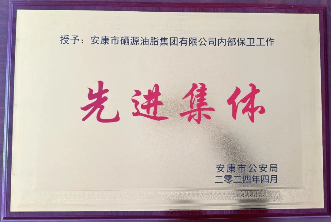 近日,安康市公安局對(duì)2023年度全市經(jīng)濟(jì)文化保衛(wèi)工作成績(jī)突出的集體和個(gè)人予以表彰通報(bào),安康市硒源油脂集團(tuán)獲得全市單位內(nèi)保工作先進(jìn)集體榮譽(yù)。
